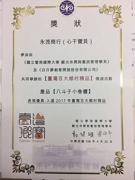 榮獲「第三屆基隆十大伴手禮」「2013年台灣百大伴手禮」 「OTOP 特色伴手禮」「2017年台灣百大鄉村精品」